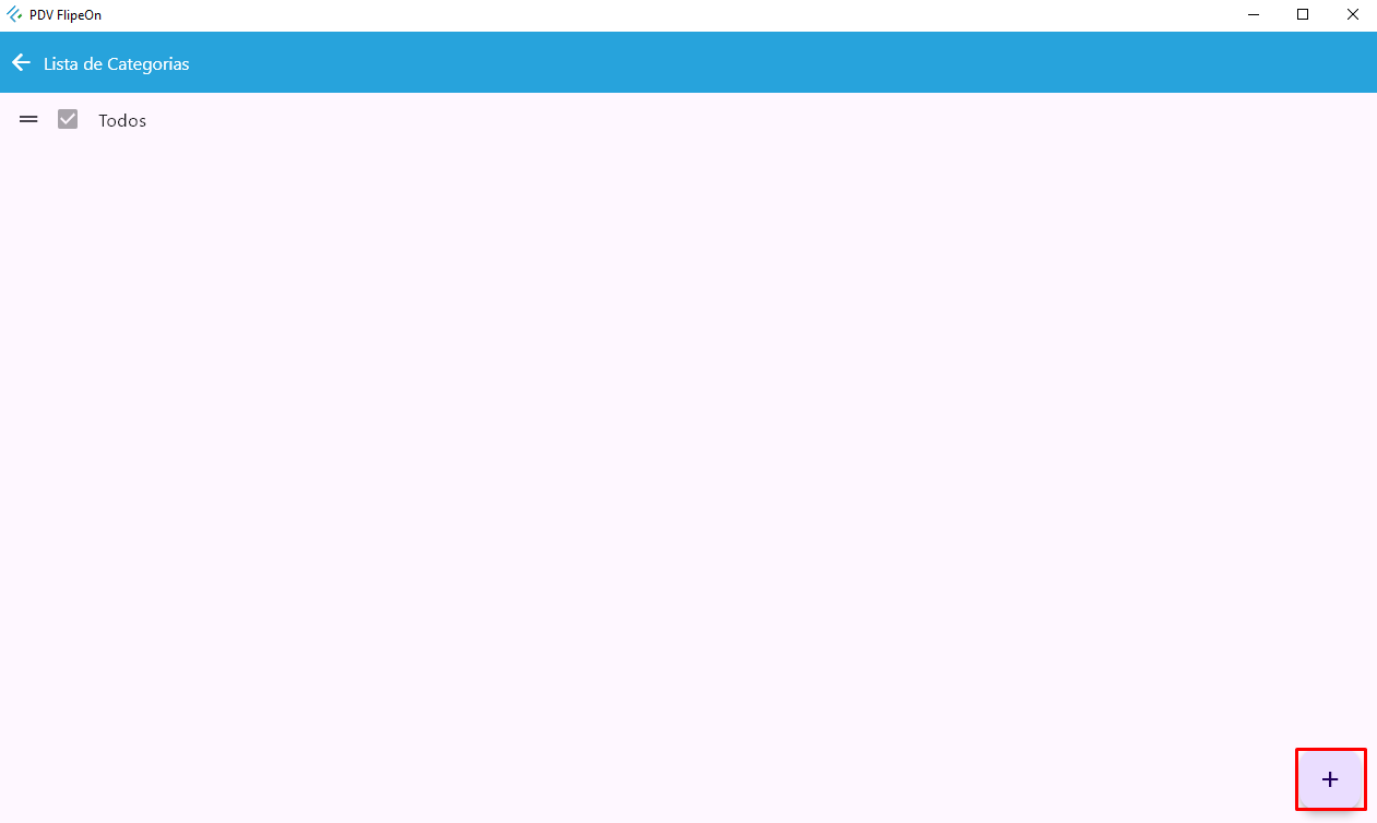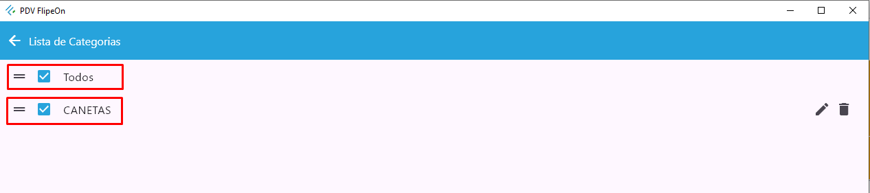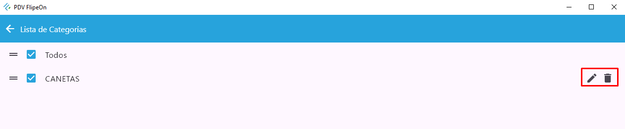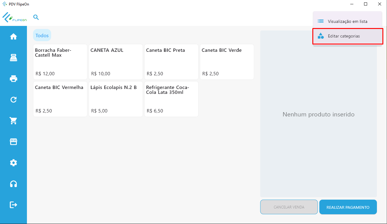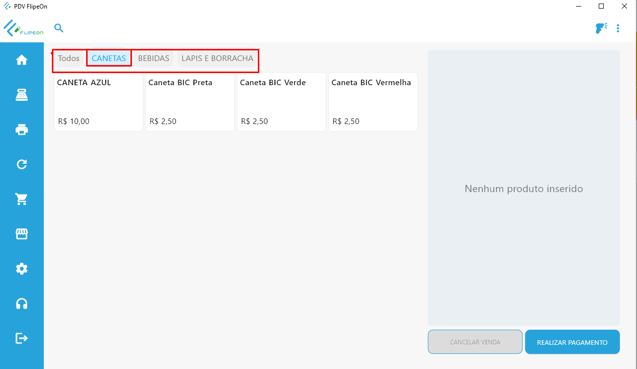 - Depois de cadastradas, as categorias serão exibidas também como opções em lista na tela principal do PDV.
