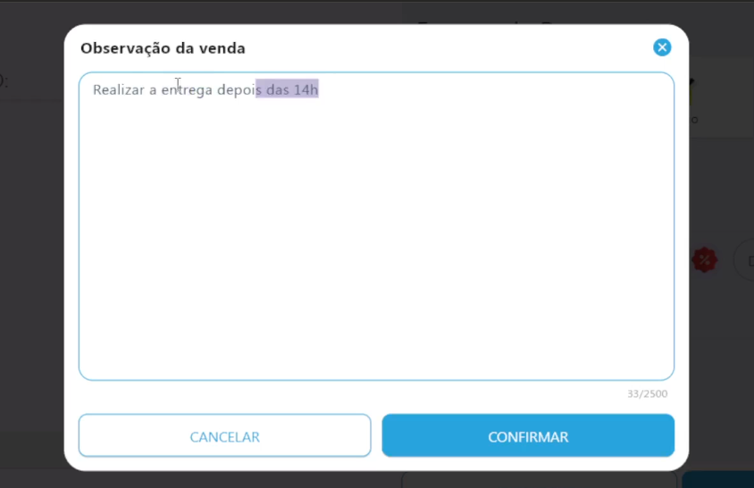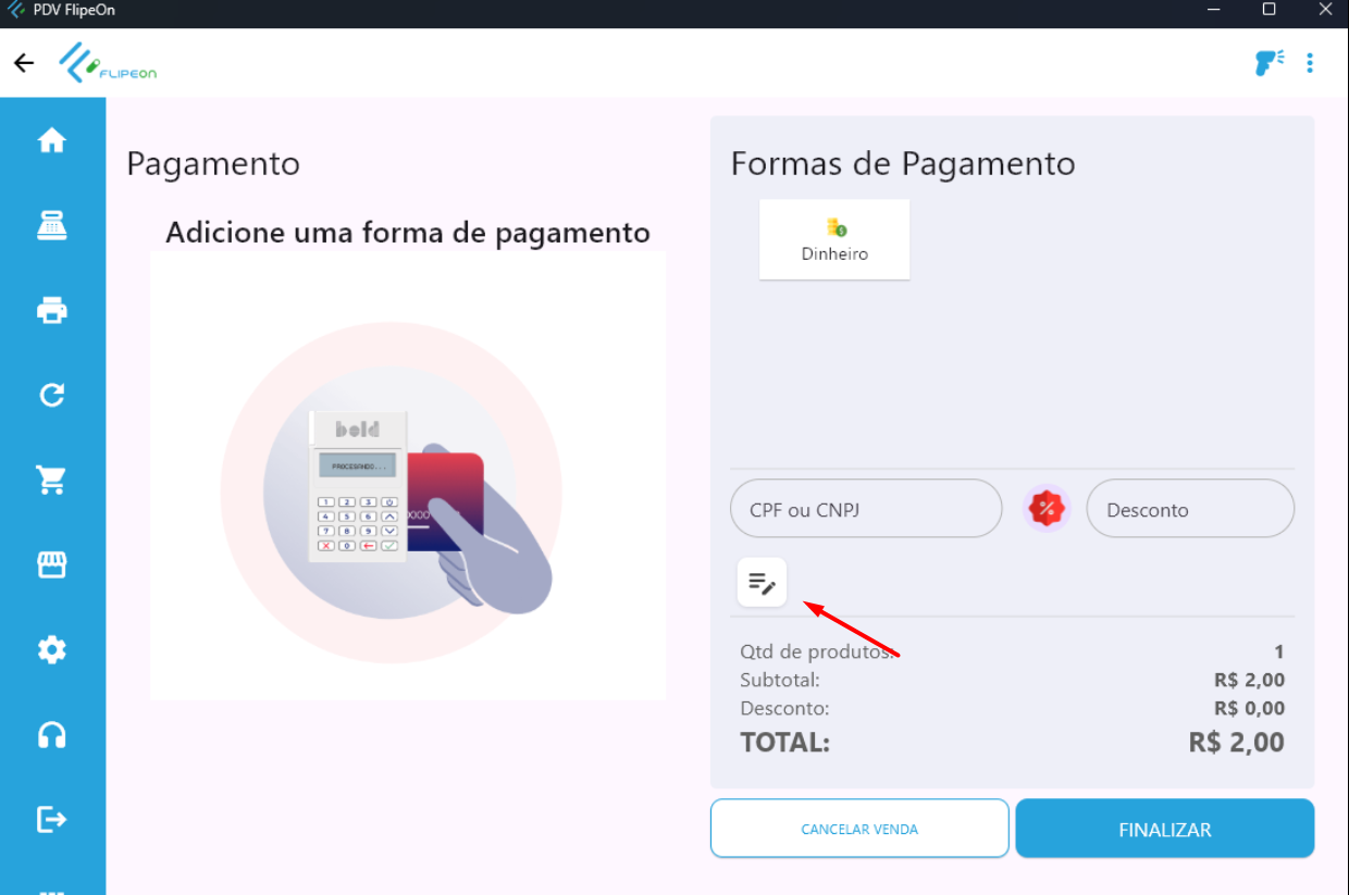- Na tela de pagamento da venda no PDV, pressione no ícone de observação