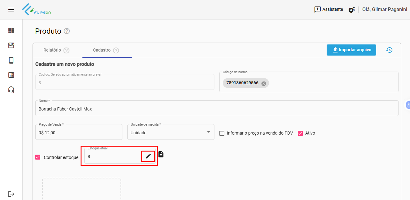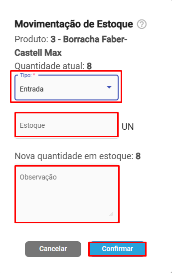 A quantidade será alterada e será exibido o estoque atual na tela de cadastro do produto.